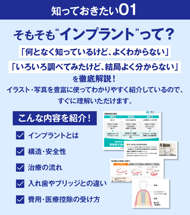 インプラントの知識が全くない方でも大丈夫。このガイドブックを読めば、インプラント治療の基礎から、あなたにぴったりの歯科医師を見つける方法まで、すべてがわかります。